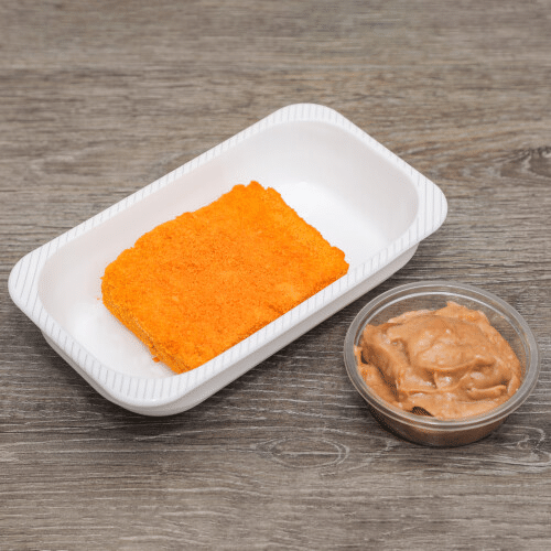 Met patat, 1 gesneden frikandel (normaal) of 2 gesneden frikandellen (groot), saus, kaas en salade